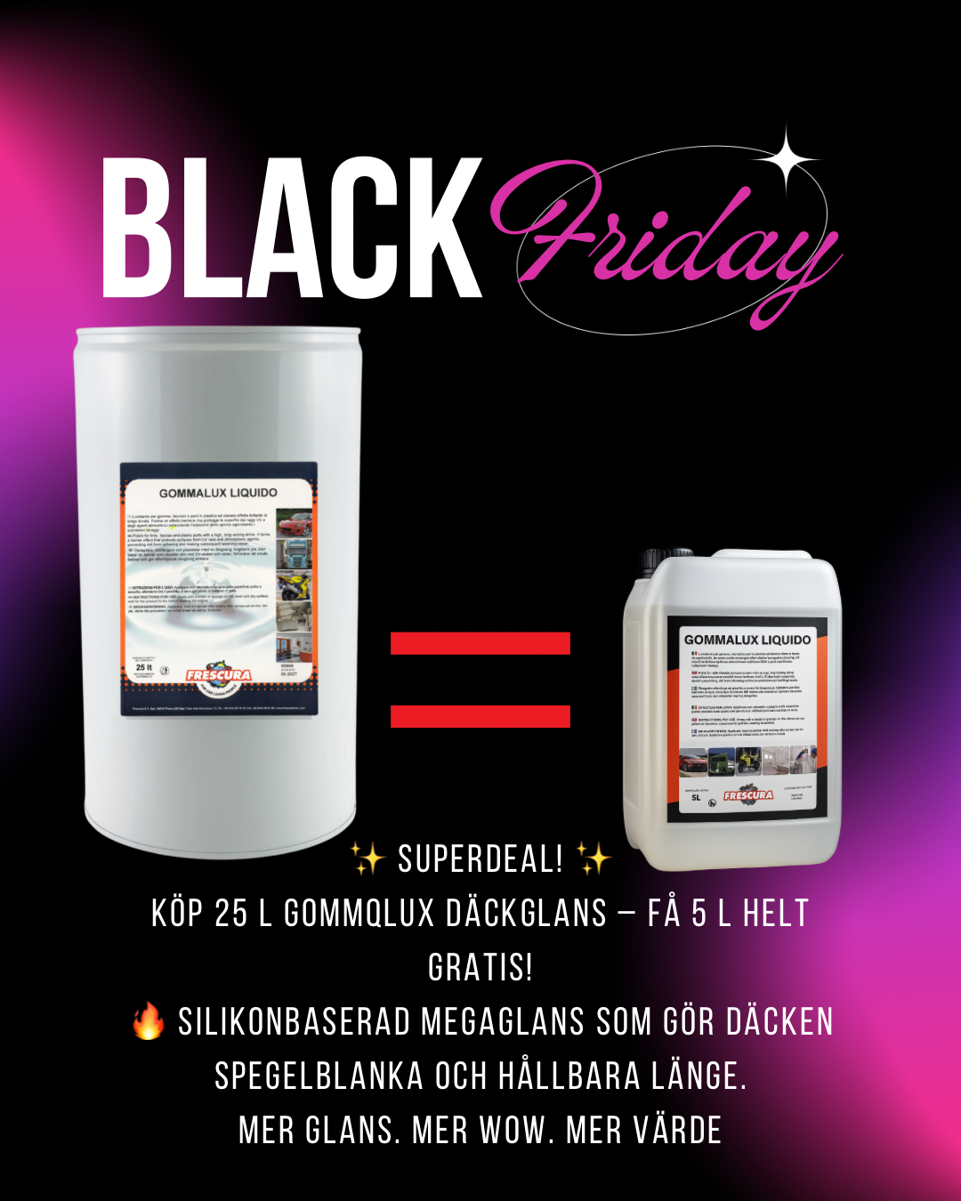 Beställ en 25 L GOMMALUX däckglans – få en 5 L utan kostnad.